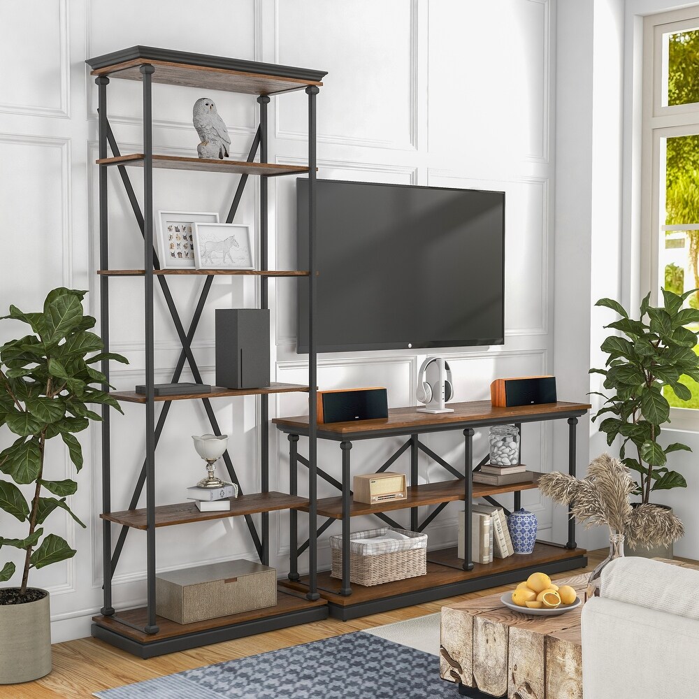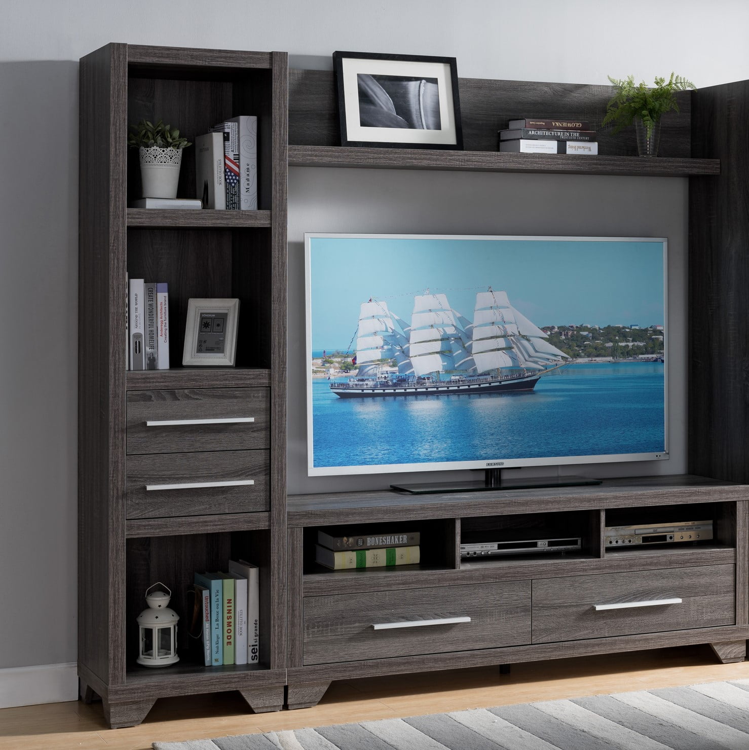 Smart Home Transitional Modern Media Tower Entertainment Center Standing Display Storage Shelves With 2 Drawers Distressed Grey Walmart Com